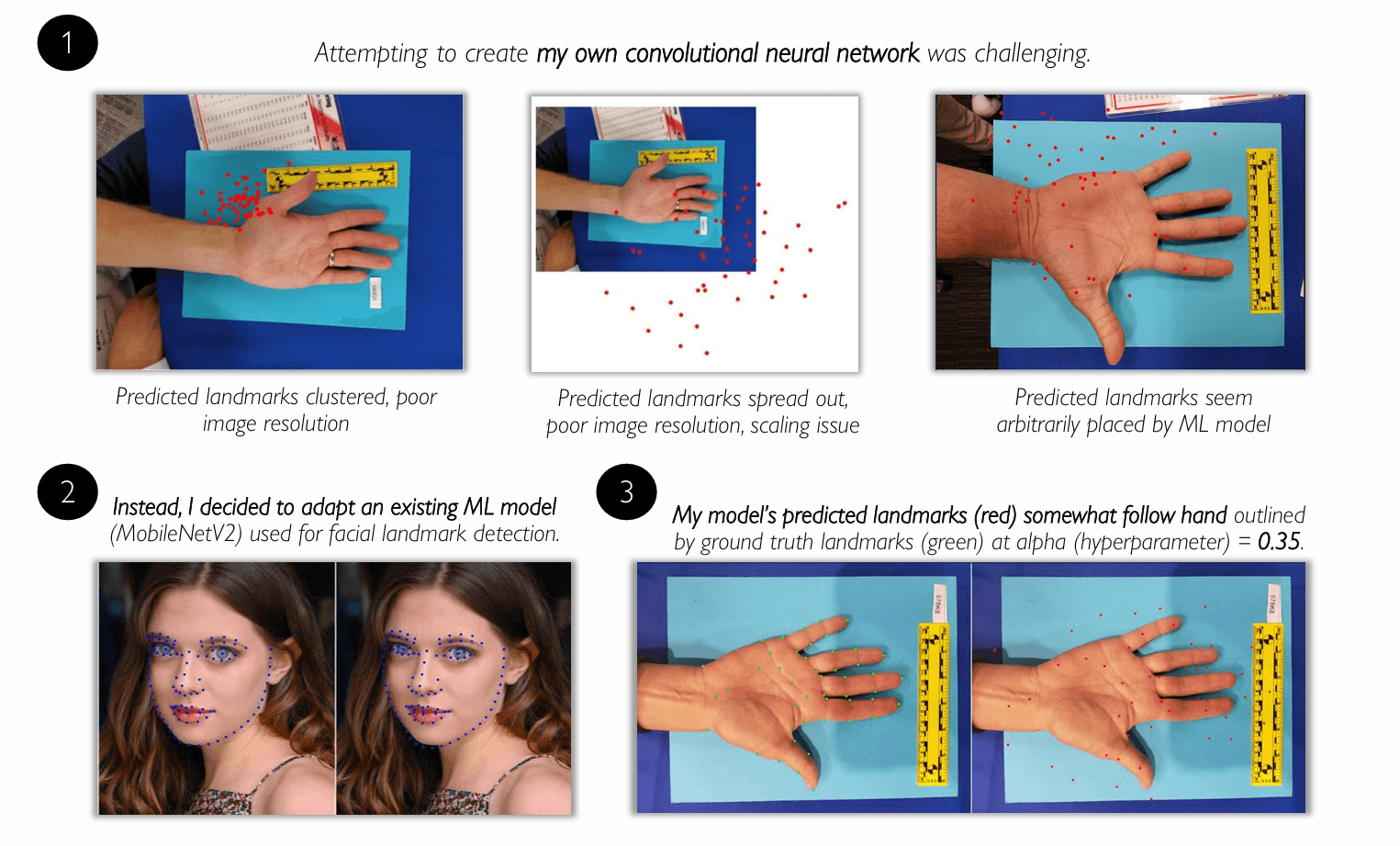 I adapted a facial landmark detection model (MobileNetV2 architecture) for hand landmark detection by building a dataset of manually annotated hand images, preprocessing each with orientation correction and color thresholding, and fine-tuning the network’s width multiplier (α) to maximize landmark localization accuracy.