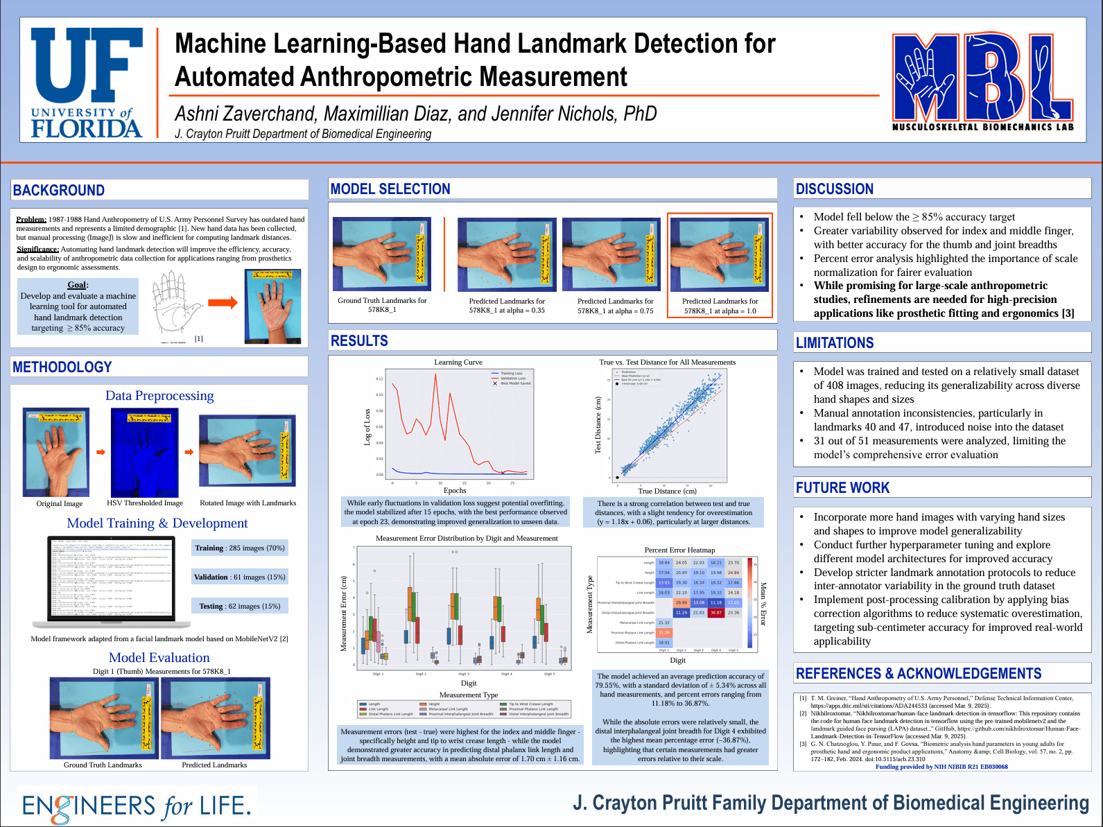 Developed an automated machine learning pipeline to replace the UF Musculoskeletal Biomechanics Lab’s slow, manual ImageJ processing of hand images, enabling rapid, consistent extraction of 31 standardized hand-landmark measurements from an original dataset of 495 hand images.