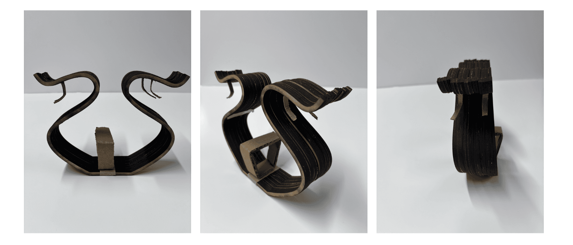 The piece is defined by a curved, vertical inverted S-shaped profile that maximizes storage capacity while maintaining a minimal footprint. Its form allows the piece to function as a spatial divider, separating resident-facing organization from guest-facing interaction without requiring walls or additional furniture.