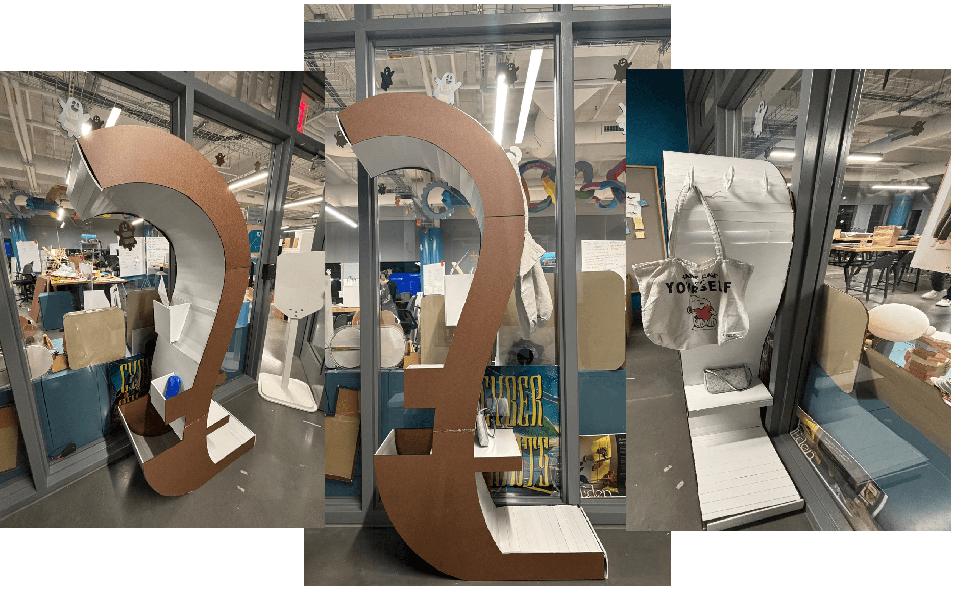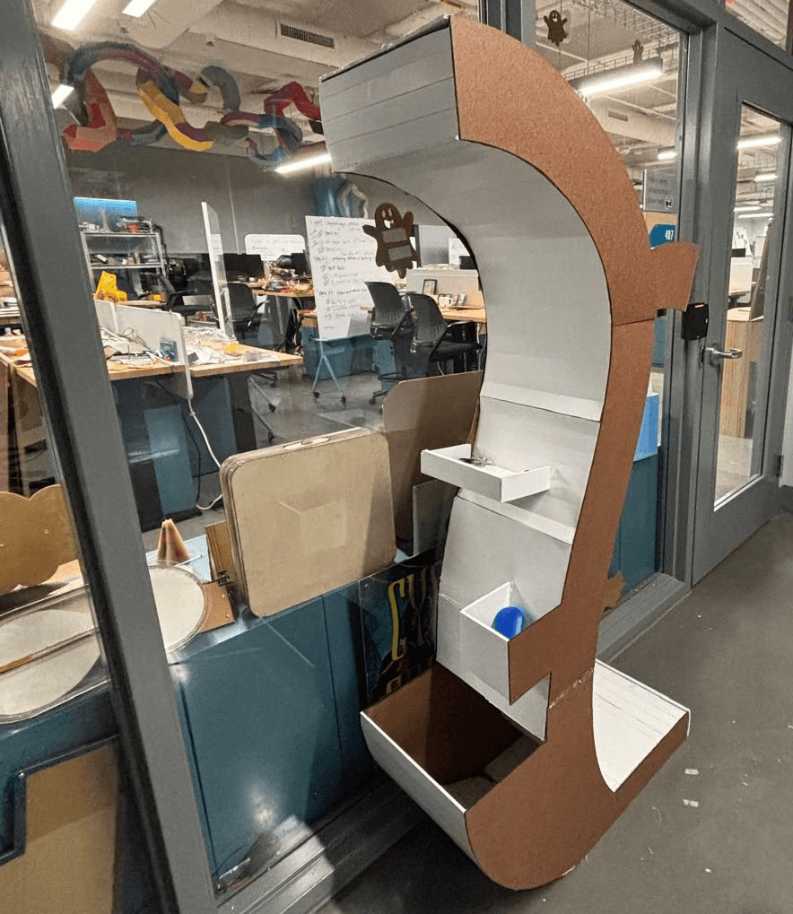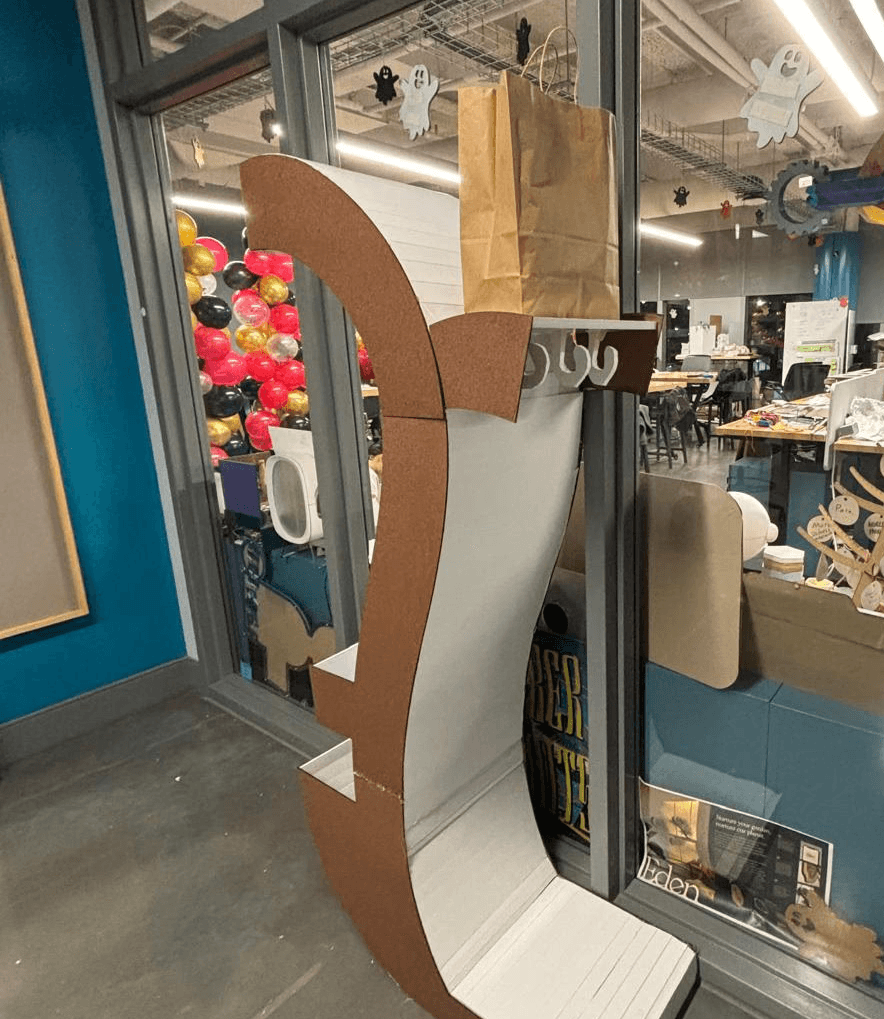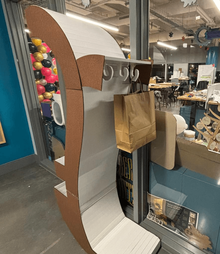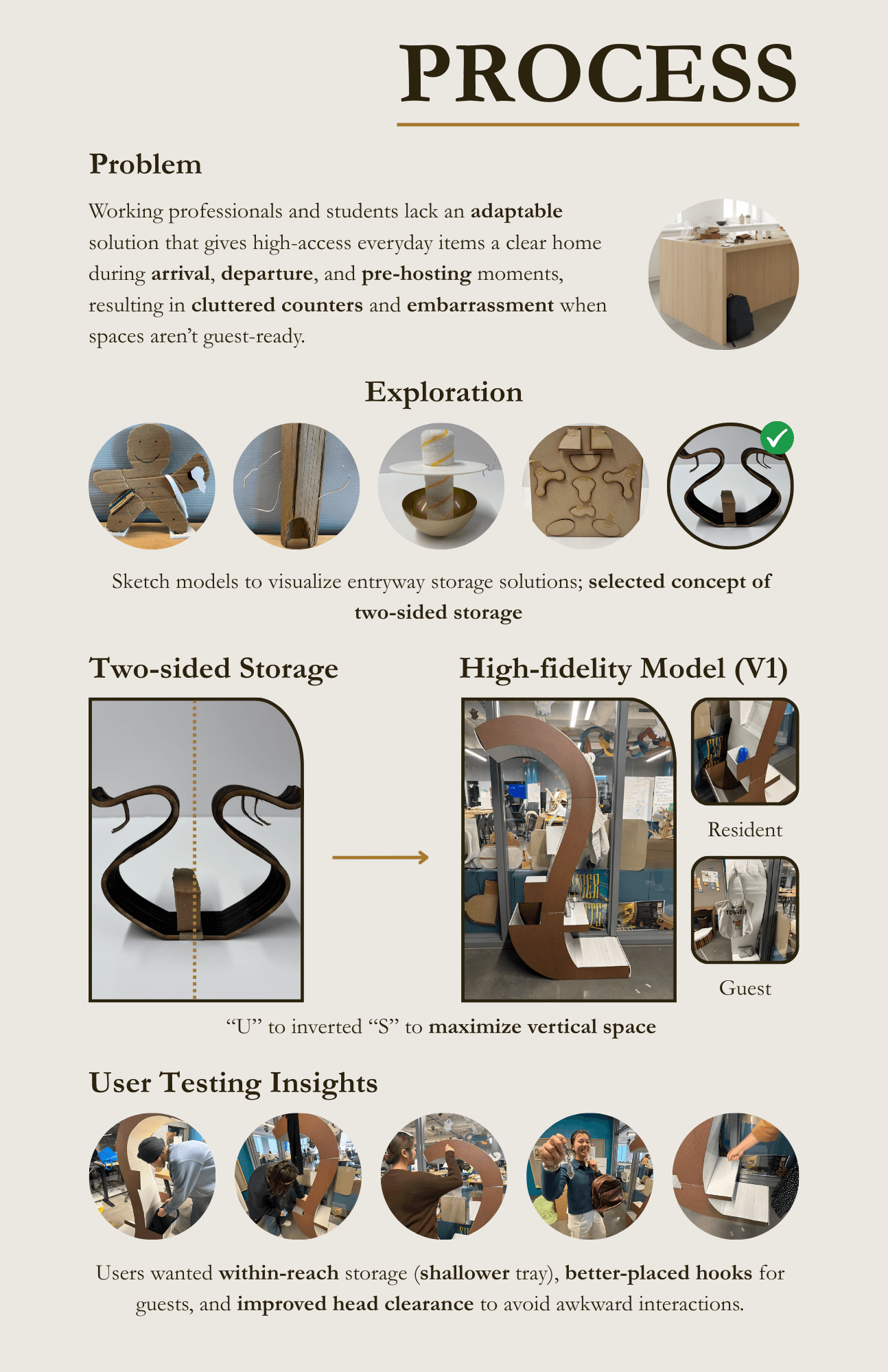 To implement feedback from user testing, changes were made (cut part of the overhang, made the trays on the 'resident' side shallower, moved the ledge up and placed hooks under the ledge on the 'guest' side) and this was the final design and accompanying product poster: