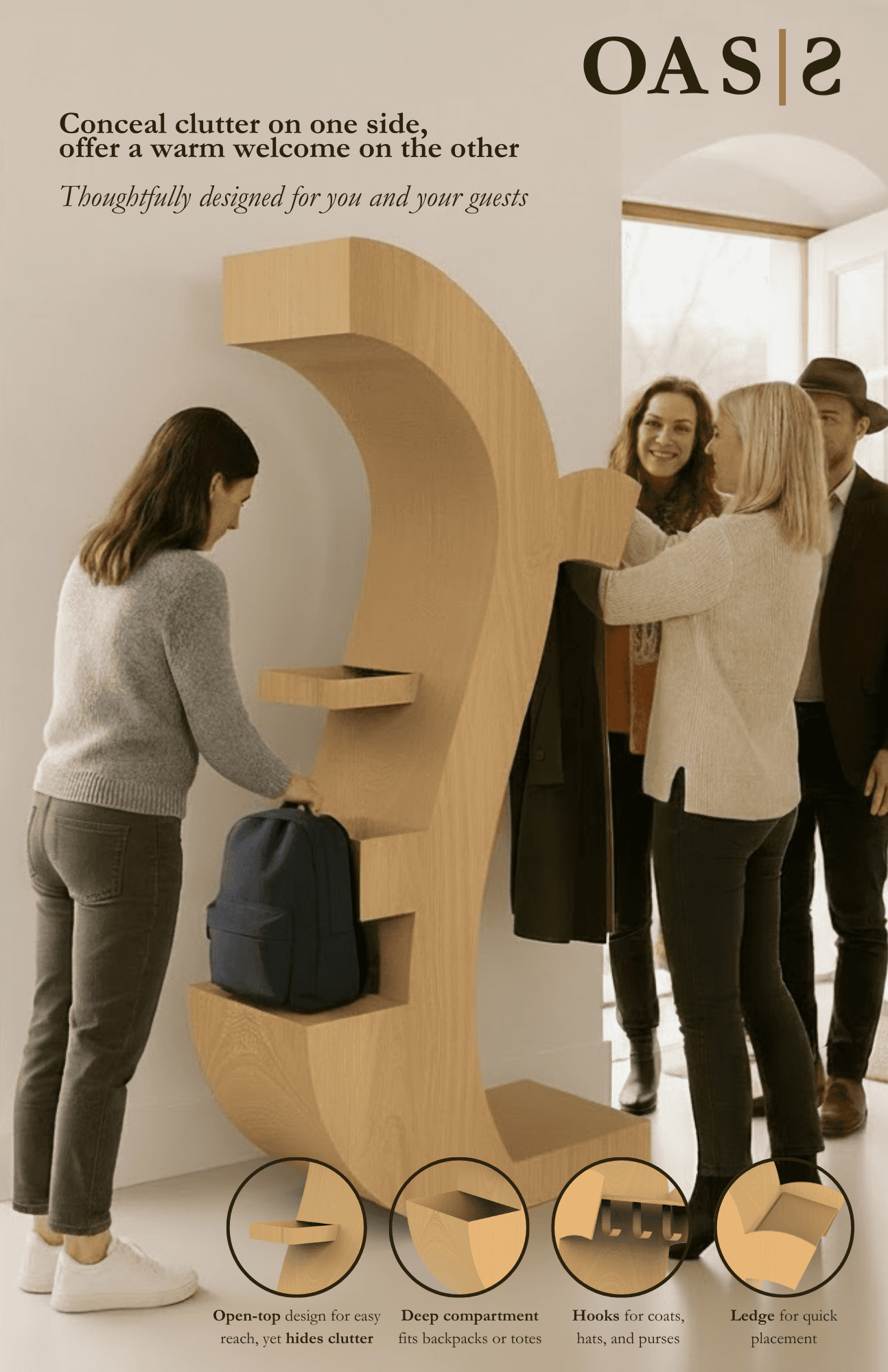 OASIS is a two-sided entryway furniture piece designed to support everyday spatial, emotional, and social transitions for both residents and guests.